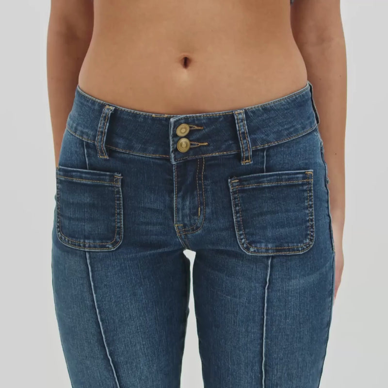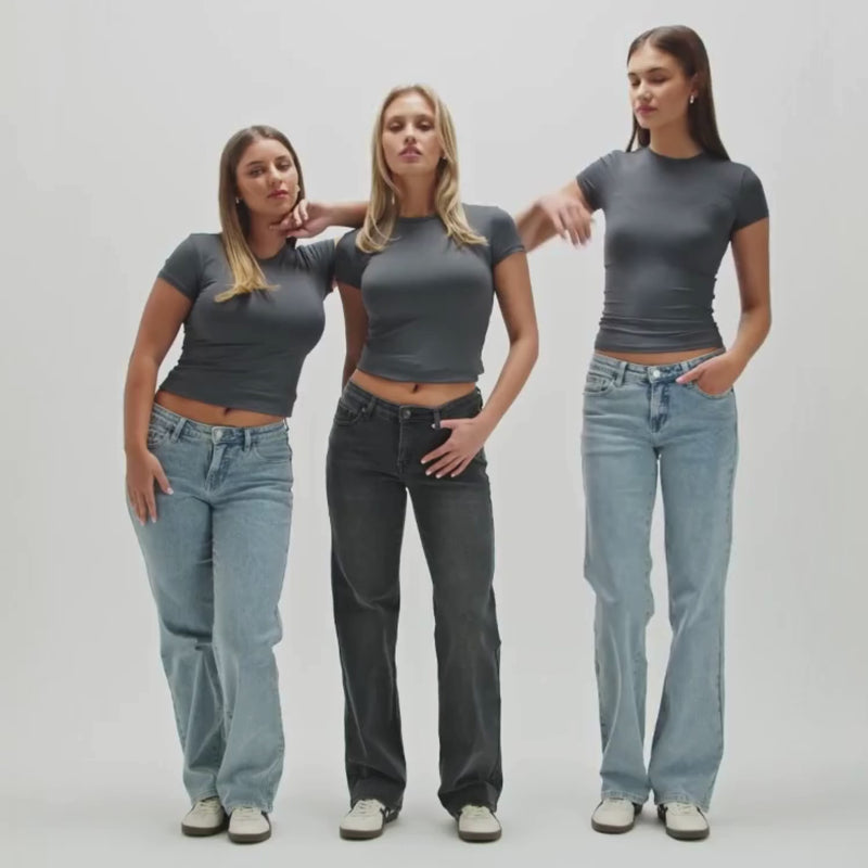Jeans med mellemhøj talje, brede ben og lommer foran og bagpå. Bæltestropperne passer både til smalle og brede bælter. Bukserne lukkes med lynlås og knap.